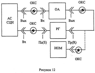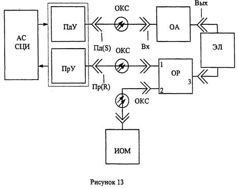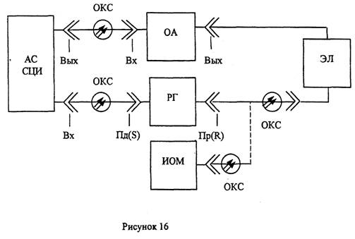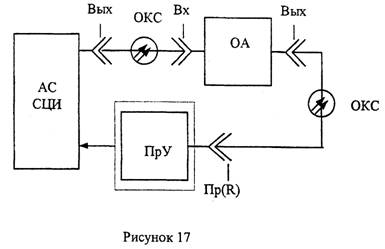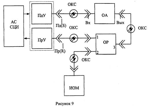 7.3.1.5 По схеме, приведенной на рисунке 12, измерение уровня чувствительности регенератора проводится с помощью ИОМ и ОА.