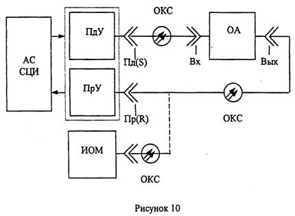 7.3.1.3 По схеме, приведенной на рисунке 10, измерение уровня чувствительности приемного устройства проводится с помощью ИОМ и ОА. Аттенюатором устанавливается наименьший уровень мощности оптического излучения, при котором коэффициент ошибок, определяемый анализатором сигнала СЦИ, не превышает значение 1х10-10, затем с помощью ИОМ измеряется уровень оптической мощности в точке Пр(R).