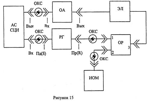 7.3.1.4 По схеме, приведенной на рисунке 11, измерение уровня чувствительности регенератора проводится с помощью ИОМ и ОА с использованием ОР 2x1.