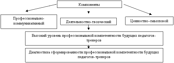 1. Понятие «профессиональная компетентность педагога-тренера» как дополняющая часть Государственного образовательного стандарта и комплексная характеристика личности, которая формируется в процессе профессионального физкультурного образования, включает гармоничное сочетание профессиональных, коммуникативных и личностных свойств и позволяет достигать качественных результатов в процессе решения типовых задач в основных видах профессиональной деятельности в сфере физкультуры. Структура профессиональной компетентности будущего педагога-тренера, представленная профессионально-деятельностным, коммуникативным и личностным компонентами, критериями которых выступают владение студентом теоретико-методическим опытом планирования, построения и управления педагогическим процессом с учетом особенностей основных видов профессиональной деятельности педагога-тренера. Содержание каждого компонента раскрывается через составляющие его компетенции, показатели и интегративные характеристики.