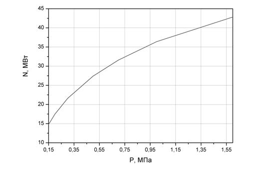 Рис. 6. Зависимость мощности СПОТ НВ АЭС-2 от давления в парогенераторе при температуре атмосферного воздуха +38 0С