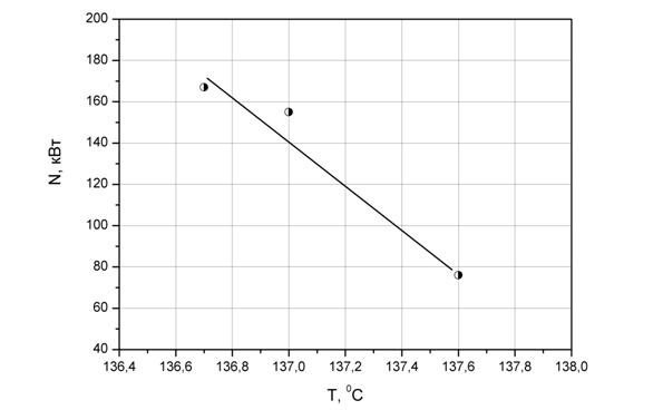 Опыты без неконденсирующихся газов были выполнены при давлении в первом контуре 0,36 МПа, соответствующем давлению в реакторной установке в случае разрыва трубопровода ГЦК. В результате получена зависимость конденсационной мощности ПГ от температуры во втором контуре.