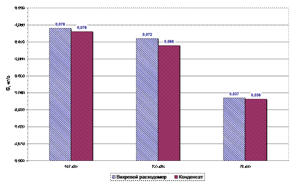 Так как основной измеряемой величиной в экспериментах являлся расход пара на входе в модель ПГ, то его измерение в опытах, как уже было сказано выше, проводилось двумя способами – с помощью вихревого расходомера и измерением объёмов конденсата, образующегося в трубчатке парогенератора. На рисунке 9 показано сравнение результатов этих измерений.