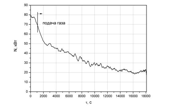 На рисунке 10 показано изменение конденсационной мощности модели ПГ в эксперименте с подачей газов. Из рисунка видно значительное снижение конденсационной мощности ПГ в ходе опыта - с 76 до 20 кВт, т. е. почти в 4 раза. Такое уменьшение мощности было вызвано накоплением неконденсирующихся газов в трубном пучке и соответственным уменьшением площади работающей теплообменной поверхности.