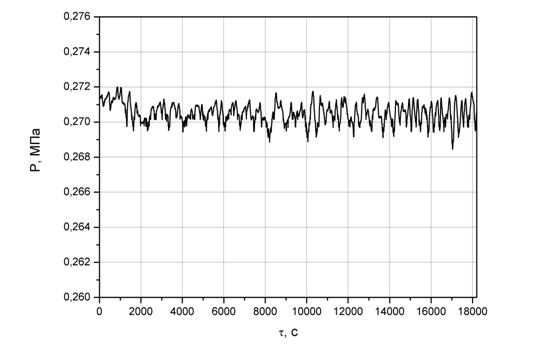 На рисунке 11 показано изменение избыточного давления на входе в модель ПГ в эксперименте. Как видно из рисунка, в ходе опыта с помощью системы поддержания давления стенда ГЕ2М-ПГобеспечивалась достаточно хорошая стабильность параметров среды в первом контуре. Амплитуда колебания давления за время всего эксперимента не превышала ±0,002 МПа.