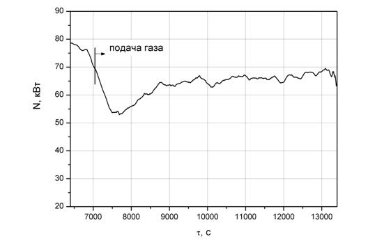 Рис. 12. Конденсационная мощность ПГ в эксперименте с подачей газа и оттоком парогазовой смеси