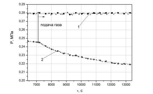 После стабилизации расхода сдувки на стенд начинали подаваться неконденсирующиеся газы с таким расходом, чтобы массовая концентрация в смеси поддерживалась на следующем уровне: СN2=2,095 г N2/кг пара, CHe=0,047 г He/кг пара. Длительность подачи газов на стенд в 1,5 раза превысила длительность первой ступени расходной характеристики системы ГЕ-2 и составила около 6000 с.