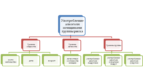 2. Поскольку употребление алкоголя женщинами группы риска представляет собой результирующую переменную широкого спектра влияний, то социально-психологические детерминанты употребления алкоголя существуют как комплекс факторов: на уровне общности, личности, группы.