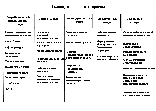 · предложена структура имиджа девелоперского проекта, включающая такие формы как бизнес-имидж, инвестиционный имидж, институциональный имидж, общественный имидж. Особое внимание уделяется бизнес-имиджу, управление которым существенно влияет на повышение идентификации девелоперского проекта со стороны целевой аудитории;