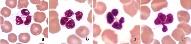 Среди гранулоцитов тюленей встречаются клетки с ядрами необычной формы: отдельные сегменты соединены друг с другом нитями хроматина, сходящимися в одной точке (рис. 1), а не последовательно, как у человека, лабораторных и сельскохозяйственных животных (Никитин, 1956; Кудрявцев и др., 1969; Абрамов, 1985; Риган и др., 2000). Это, вероятно, является одной из особенностей дифференцировки части клеток миелоидного ростка кроветворения у тюленей. Выявлены также лейкоциты, представляющие, по-видимому, предшествующую стадию дифференцировки (рис. 1г).