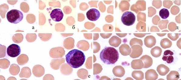 Кроме типичных малых и средних лимфоцитов как у здоровых дельфинов, так и у афалин с кожными и респираторными инфекциями присутствуют лимфоциты больших размеров с признаками активации. Ядра этих клеток округлые, реже почковидные, хроматин рыхлый, цитоплазма сильно базофильна (рис. 2е, ж).