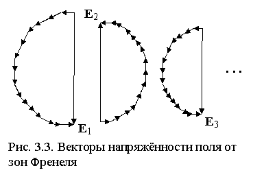 Разобьём каждую зону Френеля на большое количество колец конечной ширины и просуммируем векторы напряжённости поля в точке приёма от каждого кольца (рис. 3.3). Пусть Ei - результирующая амплитуда напряжённости поля волны в т. приёма от i-й зоны Френеля. Векторы от соседних зон направлены в проти-воположные стороны, т. к. их фазы отличаются на p. С ростом i амплитуда Ei будет убывать как за счёт удаления вторичных источников от т. приёма, так и потому, что направление максимума их излучения всё более отклоняется от направления на точку приёма. Результирующую амплитуду волн от вторичных источников всех зон Френеля можно представить в виде знакопеременного сходящегося ряда