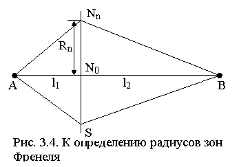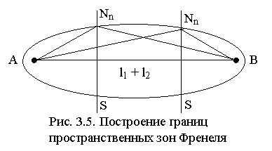 Зафиксируем на плоскости S, перпендикулярной трассе AB, точки образующей n-й зоны Френеля и будем перемещать S вдоль трассы (рис. 3.5). Из (3.4) следует, что в этом случае выполняется равенство