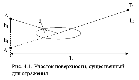 На границе раздела "земля-воздух" происходит отражение радиоволны (рис. 4.1), так что поле в т. приема B является резуль-татом интерфе-ренции поля пе-рвичной волны, пришедшей из т. излучения A, и отраженной волны. Используя метод зеркальных отображений, можно заменить влияние Земли полем источника, расположенного в точке A' зеркального отображения реального излучателя A, умноженным на коэффициент отражения R (для идеально проводящей поверхности |R| = 1). Рассматривая A'B как реальную трассу, выделим пространственные зоны Френеля, существенные для распространения. Пересечение 6 ¸ 8 первых зон с земной поверхностью образует конфокальные эллипсы, поверхность которых можно считать зоной, существенной для отражения. Если этот участок достаточно плоский, ровный и однородный, то и всю поверхность раздела можно рассматривать как ровную, однородную и безграничную.
