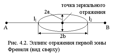 Размеры полуосей a и b эллипса, образованного первой зоной Френеля при отражении (рис. 4.2), определяются следующими формулами /2/: