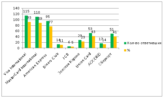 Анализ показывает, что из международных систем наиболее известны Visa International, MasterCard и AmEx, из национальных – Union Card и Сберкарт.