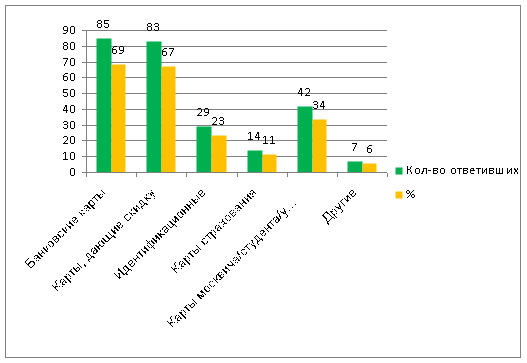 В отличие от респондентов Интернета, учащиеся Гимназии № 000 больше используют карты москвича и карты, дающие скидку, чем банковские, идентификационные и страхования.