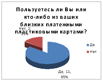 85% респондентов ответили, что они пользуются платежными пластиковыми картами. Этот результат заметно выше, чем в других группах опрошенных (77% - среди учащихся, 72% - среди Интернет-аудитории).