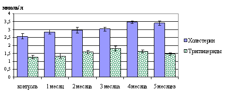 Рис. 4. Содержание общего холестерина и триглицеридов в крови при хроническом воздействии сероводородсодержащего газа в концентрации 3 мг/м3 на концентрацию (ммоль/л).