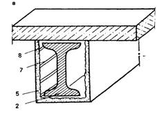 а — кирпичом; б — гипсовыми плитами; в — штукатуркой; 1 — стальная колонна; 2 —стальная балка; 3 —- кирпич; 4 —гипсовая плита; 5— штукатурка; 6 — анкер; 7 — арматурный каркас; 8—объемная сетка