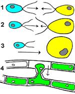Но не всегда размножение спорами – бесполое размножение. У шляпочных грибов, например, образованию спор предшествует кариогамия – слияние ядер дикарионической клетки, затем происходит мейоз и образуются базидиоспоры – споры полового спороношения. Из них развивается первичный одноядерный мицелий, затем происходит слияние клеток + и – мицелиев и образуется вторичный, двуядерный (дикарионический) мицелий, на котором образуются плодовые тела.