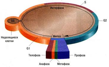 Клеточный и митотический циклы. Под клеточным циклом понимают совокупность событий, происходящих от образования клетки (включая само деление) до ее деления или гибели. Промежуток времени от деления до деления называют интерфазой, которая в свою очередь делится на три периода – G1 (пресинтетический), S (синтетический) и G2 (постсинтетический). G1 – период роста, по времени самый продолжительный и включает G0 период, когда выросшая клетка или находится в состоянии покоя, или дифференцируется, превращается, например, в клетку печени и функционирует как клетка печени а затем отмирает. Набор хромосом и ДНК диплоидной клетки в этот период 2n2c, где n – число хромосом, с – число молекул ДНК. В S-период происходит основное событие интерфазы – репликация ДНК и набор хромосом и ДНК становится 2n4c, так число молекул ДНК удвоилось. В G2 клетка активно синтезирует необходимые ферменты, происходит увеличение числа органоидов, набор хромосом и ДНК не изменяется – 2n4c. Возможность выхода клетки из G2 периода в G0 период в настоящее время большинством авторов отрицается.
