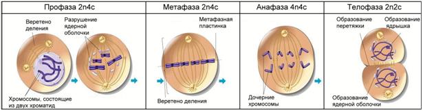 Митоз – основной способ деления эукариотических клеток, при котором дочерние клетки сохраняют хромосомный набор исходной материнской клетки. Митоз представляет собой непрерывный процесс, в котором выделяют четыре фазы: профазу, метафазу, анафазу и телофазу.