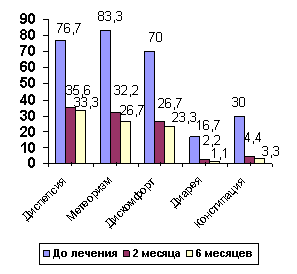 Было отмечено, что микробиологические нарушения в толстой кишке, регистрируемые при бактериологическом исследовании фекалий, соответствующие II и III степени дисбиоза, у большинства больных сопровождались характерными клиническими симптомами.