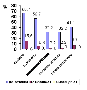 В то же время, в контрольной группе динамика регрессии вышеуказанных симптомов была значительно медленнее, кроме того увеличилось число больных, предъявляющих жалобы на снижение аппетита и потерю массы тела. Через 2 месяца наблюдения симптомы интоксикации (за исключением повышения температуры тела) в контрольной группе встречались достоверно чаще, чем у пациентов основной группы. Обращает на себя внимание и то, что через 6 месяцев химиотерапии треть больных контрольной группы отмечали общую слабость, более половины - снижение аппетита, и около половины из них имели дефицит массы тела, в то время, как потливость и повышение температуры тела (симптомы, отражающие воспалительный процесс) практически не встречались. Данное обстоятельство, на наш взгляд, можно было объяснить нарастанием тяжести дисбактериоза среди этих пациентов.