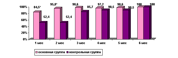 Прекращение бактериовыделения по данным культурального исследования на плотных средах также достоверно (р<0,05) быстрее наблюдалось у пациентов основной группы. Через 2 месяца лечения прекращение бактериовыделения было достигнуто у 91,1% наблюдаемых основной и только у 66,7% пациентов контрольной группы. Через 6 месяцев химиотерапии практически все больные прекратили бактериовыделение, положительный результат посева мокроты сохранялся лишь у одного пациента контрольной группы.