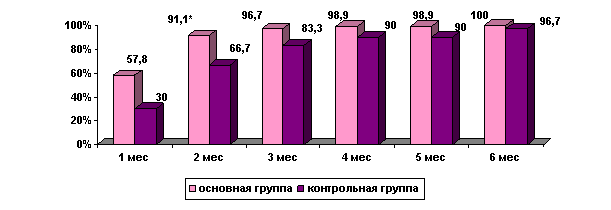 Через 6 месяцев наблюдения только у одного больного основной группы сохранялся дисбиоз III степени, у 30 (33,3%) имелись умеренные дисбиотические нарушения, а у большинства больных –,3%) были незначительные нарушения микробиоценоза, что явилось следствием положительного воздействия терапии, направленной на коррекцию дисбактериоза. Кроме того, к шестому месяцу лечения у 3 пациентов удалось достичь полного восстановления нормальной микрофлоры толстой кишки.