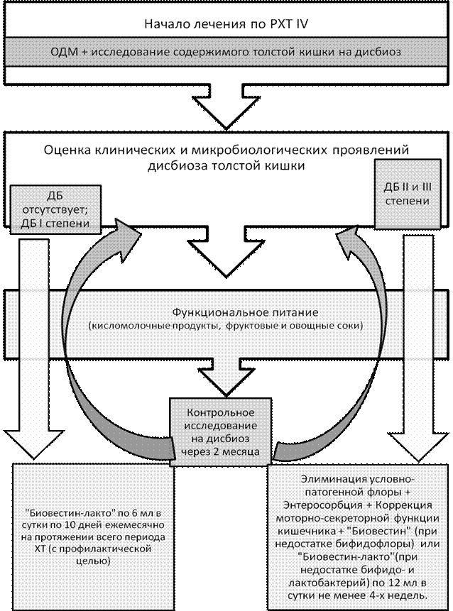 Рис. 9. Алгоритм коррекции дисбиоза толстой кишки у больных инфильтративным туберкулезом легких с МЛУ возбудителя