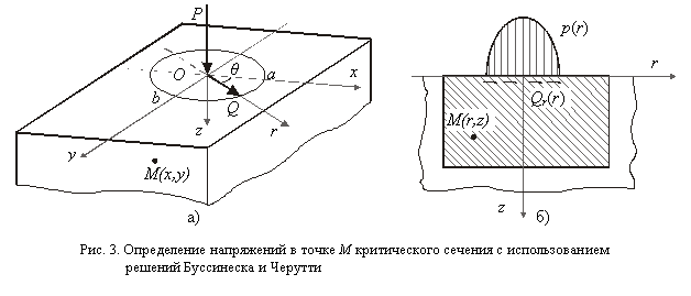 Во втором подходе применена модель, базирующаяся на критерии усталостной прочности Данг Вана. Коэффициент запаса выносливости η(z) вычисляется за несколько шагов с использованием следующих допущений. Контактирующие тела рассматриваются как идеально упругие полупространства с распределением давлений по Герцу и тангенциальными силами на поверхности эллиптического контакта. Предполагается полное скольжение. Предполагается также, что напряжённое состояние соответствует плоской деформации. Напряжение увязывается с выбором критического сечения, определяемого плоскостью (P,Q), проходящей через центр О контактного пятна (рис. 3а). Реализовано сложение аналитических решений Буссинеска и Черутти для сосредоточенной нормальной и касательной внешних нагрузок. Такая процедура позволяет минимизировать затраты машинного времени.