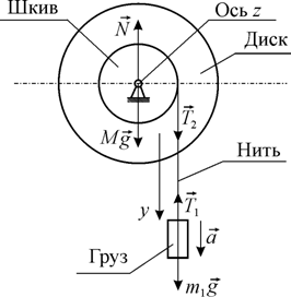 Так как предполагается, что нить нерастяжима и невесома, то ускорение всех точек нити и груза одинаковы, причем в отсутствии проскальзывания нити линейное (тангенциальное) ускорение обода диска равно ускорению груза. Силы натяжения нити Т1 и Т2 равны между собой (Т1 = Т2 = Т).
