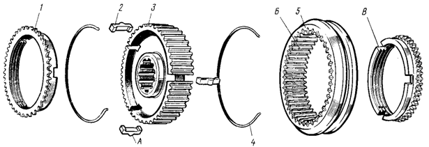 На наружной поверхности ступицы (см. рис. 86) нарезаны шлицы, по которым может перемещаться муфта 5 синхронизатора. Кроме шлицев, на ступице вырезаны на равных расстояниях один от другого три продольных паза, в которых помещены три штампованных сухаря 2 с выступами А на середине. Сухари прижаты к шлицам муфты 5 двумя пружинными кольцами 4, причем выступы А сухарей входят в кольцевую проточку Б муфты. С обеих сторон ступицы установлены латунные блокирующие кольца 1. На торцах этих колец, обращенных к ступице, сделано по три паза В, в которые входят концы сухарей 2.