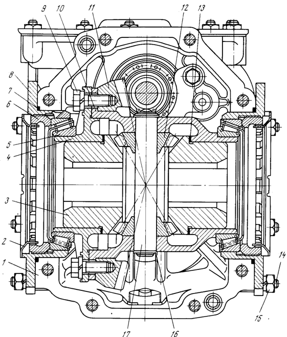 Рис. 87. Главная передача: 1 — картер коробки передач; 2 — стопор регулировочной гайки; 3 — шестерня полуоси; 4 — крышка корпуса дифференциала; 5 — конический подшипник; 6 — регулировочная гайка; 7 — уплотнительное кольцо; 8 — корпус подшипника дифференциала; 9 — болт крепления ведомой шестерни; 10 — корпус дифференциала; 11 — ведомая шестерня главной передачи; 12 — сателлит; 13 — опорная шайба шестерни полуоси; 14 — шпильки крепления корпуса дифференциала; 15 — гайки; 16 — стопорное кольцо пальца сателлитов; 17 — палец сателлитов.