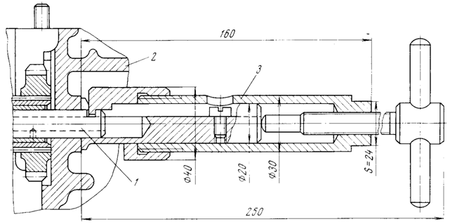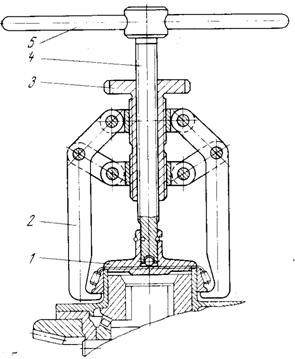 снять внутренние обоймы конических подшипников. Для этого, поворачивая воротком 5 винт 4 против часовой стрелки, поднять упор 1 так, чтобы лапки 2 зашли под корпус подшипника в два углубления. Затем, вращая за маховичок 3 втулки по часовой стрелке, свести лапки 2 и, вращая вороток 5, снять внутреннюю обойму подшипника;
