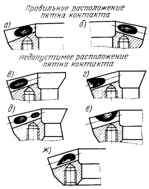 Рис. 91. Расположение пятна контакта на зубьях ведомой шестерни главной передачи: а — пятно на стороне зуба, соответствующей движению автомобиля вперед; б — то же назад; в — пятно на внешней половине зуба; г — пятно выходит на внешний торец зуба; д — пятно раздвоено; е — пятно выходит на верхнюю кромку зуба; ж — пятно расположено у основания зуба; недопустимо также бегающее пятно контакта (восьмерка), вызываемое короблением зуба.