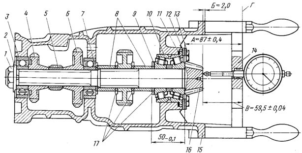 Рис. 92. Установка ведущей шестерни главной передачи: 1 — гайка ведущего вала главной передачи; 2 — отгибная шайба; 3 — задний подшипник; 4 — ведомая шестерня IV передачи; 5 — ведущая шестерня привода спидометра; 6 — ведомая шестерня III передачи; 7 — упорная шайба ведомой шестерни II передачи; 8— распорные втулки шестерен; 9, 11 — регулировочные прокладки; 10 — передний упорный подшипник; 12 — крышка подшипника; 13 — болт; 14 — контрольное приспособление для подбора толщины регулировочных шайб; 15 — картер коробки передач; 16 — ведущая шестерня главной передачи; 17 — упорные шайбы шестерен передач; Г — ось отверстия диаметром 1150,035 мм.
