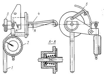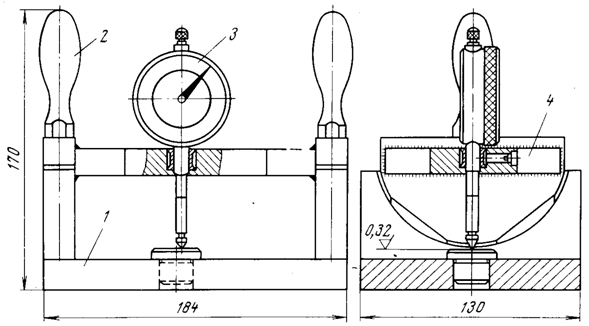 Рис. 93. Контрольное приспособление для подбора толщины регулировочных шайб: 1 — корпус; 2 — ручка; 3 — индикатор; 4 — основание.