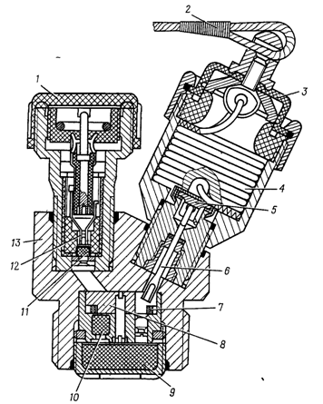 1 – пробка; 2 - стальной тросик; 3 – мембрана; 4 - капроновый шнур; 5 - серьга; 6 - стопор; 7 - ленточная пружина; 8 - поворотная втулка с капсюлем-детонатором; 9 и 10 – детонаторы; 11 – усилитель; 12 – электровоспламенитель; 13 - корпус