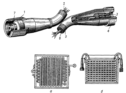 а — вид сверху; б — вид сбоку; 1 - накидная гайка; 2 - провод; 3 - лепестковый контакт; 4 - втулка с резьбой; 5 - капроновая оплетка; 6 - продольные силовые нити; 7 - выступающий контакт