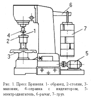 Твердость по Бринеллю. Все узлы и приспособления прибора Бринеля (рис.1) крепятся на массивной станине. Образец, деталь, изделие (1) устанавливают на столик (2), который с помощью маховика (3) поднимается и образец прижимается к шарику, вставленному в оправку (4). Включается электродвига, который убирает упор из-под рычага (6), и через этот рычаг груз (7) действует на индентор и вдавливает его в поверхность. Соотношение плеч рычага 1:50, т. е., например, гиря весом 10 кг создает нагрузку 500 кг. Набор гирь обеспечивает возможность создания нагрузки от 62,5 до 3000 кг. Время выдержки устанавливается и автоматически выдерживается с помощью реле и конечного выключателя. После выдержки нагрузка электродвигателем автоматически снимается, и диаметр получившегося сферического отпечатка измеряется с помощью специального прибора с точностью 0,05 мм.