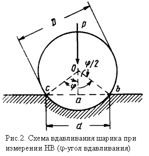Твердость по Бринелю (НВ) определяется как отношение нагрузки к площади отпечатка (рис. 2), т. е. можно говорить, что НВ это какое-то условное усредненное напряжение в зоне отпечатка при вдавливании шарика. Размерность НВ – МПа (или кг/мм2). Зная диаметр шарика и диаметр отпечатка, можно определить площадь отпечатка по формуле