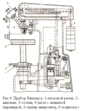 Таким образом HV, имеющую такую же размерность, как и HВ, можно рассматривать, как усредненное значение напряжения в зоне отпечатка. Нагрузка при измерении HV может быть от 5 до 100 кг. Это, а также то, что в качестве материала индентора используется алмаз, позволяет измерять HV материалов практически любой твердости. Методика измерения HV аналогична методики измерения HВ: к индентору прижимают образец (рис. 4), на индентор через систему рычагов подается усилие от подвески с набором гирь. После выдержки (15-30 секунд) нагрузка автоматически снимается и производится измерение диагонали отпечатка. Так же как и при определении НВ величину HV обычно находят по таблицам, в которых по формуле для разных нагрузок рассчитаны значения HV в зависимости от d.