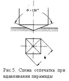 Важным достоинством способа измерения твердости по Виккерсу является то, что отпечатки всегда являются геометрически подобными. Поэтому можно достаточно строго сопоставлять результаты измерения твердости, сделанные при разных нагрузках. Поскольку угол между противоположными гранями пирамиды равен 1360, угол вдавливания j (рис.5) получается примерно такой же, как и при вдавливании шарика. Это означает, что при вдавливании такой пирамиды в материале создается напряженное состояние примерно такое же, как и при вдавливании шарика, и поэтому HV»НВ.