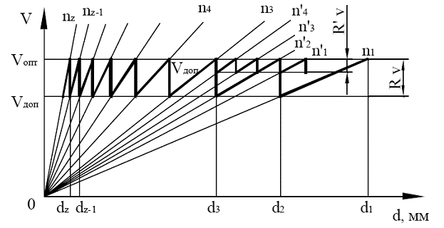 Зависимость скорости от диаметра заготовки (хода инструмента) для заданной частоты изображается прямой линией (лучом) (Рис. 2). Область рекомендуемых скоростей резания определяют от оптимальной vопт до допустимой vдоп исходя из периода стойкости инструмента. Границы этой области и абсолютные значения скоростей зависят от обрабатываемого материала, вида инструмента и обработки. Переключение частоты производят при выходе действительной скорости за пределы области