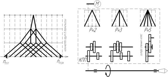 Рис. 3 позволяет получить наглядное представление о последовательности проектирования кинематической структуры. На начальном этапе (рис. 3-а) по данным технического задания на проектирование устанавливаются границы диапазона частот вращения исполнительного органа (шпинделя). Затем по описанной выше методике определяется необходимое количество ступеней скорости шпинделя (рис. 3-б) и намечается тип двигателя (рис. 3-в).