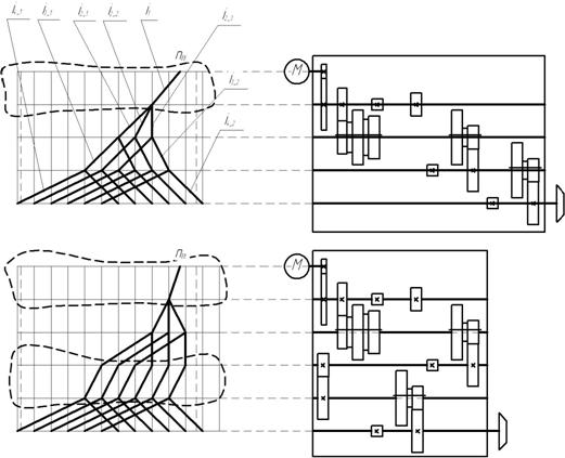 Представленные на рис. 5 кинематические схемы коробок скоростей и соответствующие им структурные сетки имеют следующие особенности. Коробка на рис. 5-а позволяет быстро (на малых оборотах даже на ходу) осуществлять переключение ступеней скорости во всем диапазоне регулирования, т. е. является наиболее универсальной из трех изображенных. Недостатком является то, что в ее структуре больше передач (три вместо двух), следовательно, она имеет большие габариты.