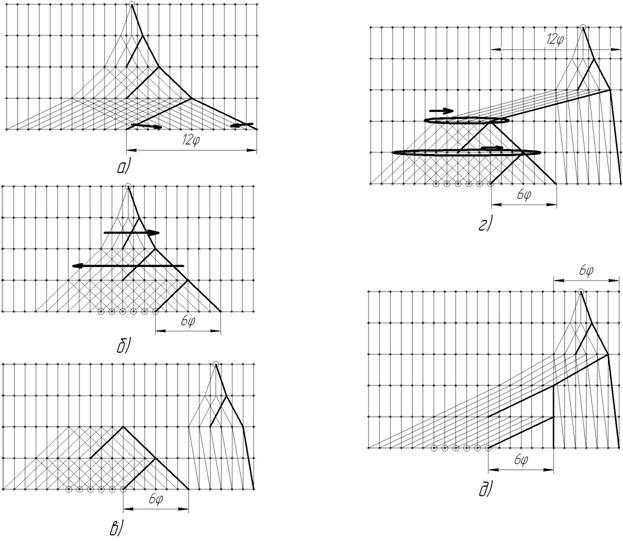 Базовая кинематическая структура (рис. 9-а) для последней групповой передачи имеет характеристику х=12j, что больше допустимого значения (для j>1,12). При переходе к сложенной структуре для последней групповой передачи уменьшают характеристику до х=6j. При этом общий диапазон регулирования сокращается. Коробка не обеспечивает частот вращения в верхней и нижней частях диапазона, а в середине несколько ступеней совмещаются (Рис. 9-б). Кинематическую структуру разделяют на две части и выполняют смещение структурных сеток к краям диапазона (Рис. 9-в). В кинематическую схему добавляют групповую передачу, осуществляющую соединение исполнительного органа (шпинделя) с основной или дополнительной кинематической цепью (Рис. 9-г). Для окончательного оформления кинематической структуры осуществляется коррекция передаточных отношений групп дополнительной кинематической цепи для обеспечения характеристики переключающей группы в допустимых пределах.